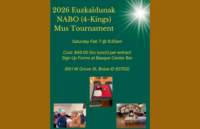 Otsailaren 7an, larunbata, Boiseko Euzkaldunak euskal etxeak bere Mus Txapelketa egingo du, NABOren nazionalerako sailkagarria.