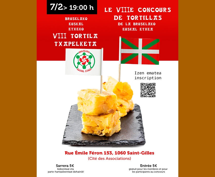 Bruselako VIII. patata tortilla lehiaketa, otsailaren 7an, 19etan, Bruselako Euskal Etxea (BEE) antolatzaile. Lehiaketaren ondoren, festa eta txosna zabalik: kalimotxoa, garagardoa, musika... Helbidea, Cite des Associations - Rue Emile Feron 153, St Gilles, Bruxelles.