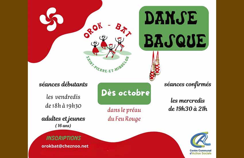 St Pierre eta Mikeluneko Orok Bat dantza taldeak luzatzen du gonbidapena ikasturte berriaren karietara: Bueltan da euskal dantza, urriaren 1ean eta ondoko asteazkenetan, maila aurreratukoentzat, Feu Rouge Eskolako patioan, 19:30etatik 21etara. Hasiberrientzat ikus ostiralean, urriaren 3an, eta ondoko ostiraletan. 16 urtetik gorakoentzat.