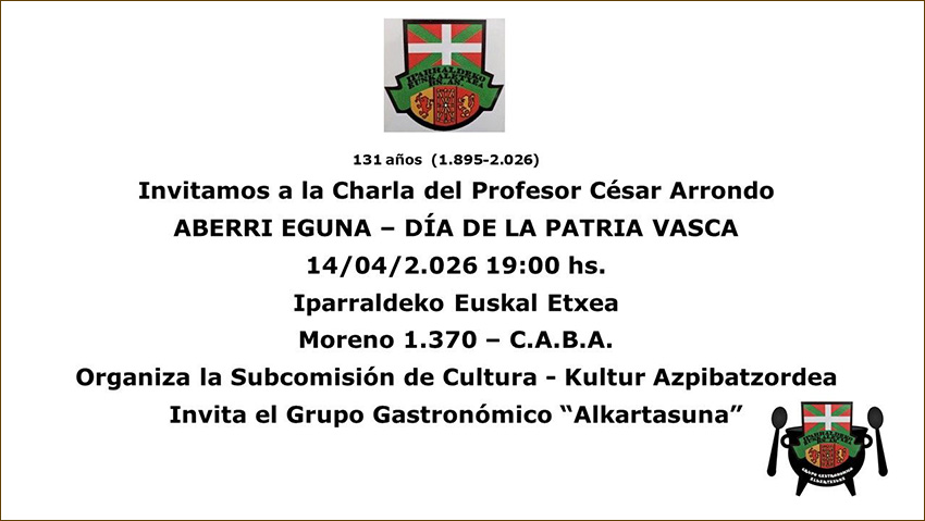 Apirilaren 14an, asteartea, 19:00etan, César Arrondoren hitzaldia Aberri Egunaz Buenos Airesko Iparraldeko Euskal Etxean eta ondoren lagunarteko otordua partrekatuko dute bertaratutakoek.