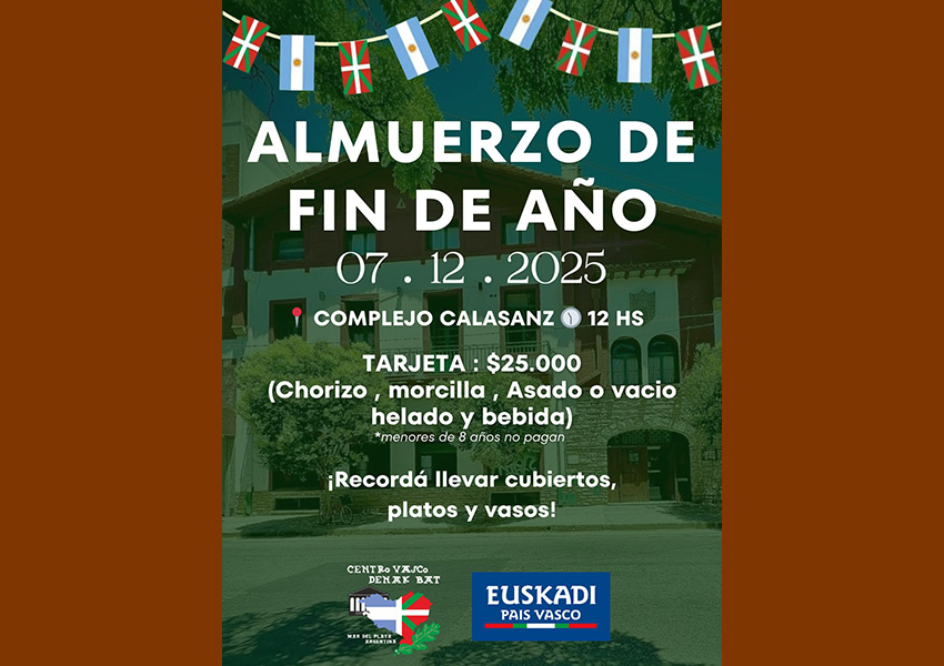 Mar del Platako Denak Bat Euskal Etxeak abenduaren 7an 12etatik aurrera ospatuko du Urteari Amaiera jartzeko ohiko Afari-Festa, Calasanz Konplexuan (Armando Chulac 6635).