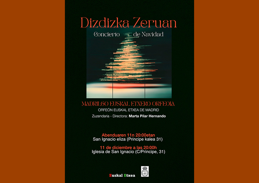 Abenduaren 11n, 20:00etan, Madrilgo Euskal Etxeko Orfeoiaren Gabonetako Kontzertura hiriko San Ignazio elizan (Príncipe 31), Gabonetako espirituan murgiltzeko errepertorio zoragarri batekin.