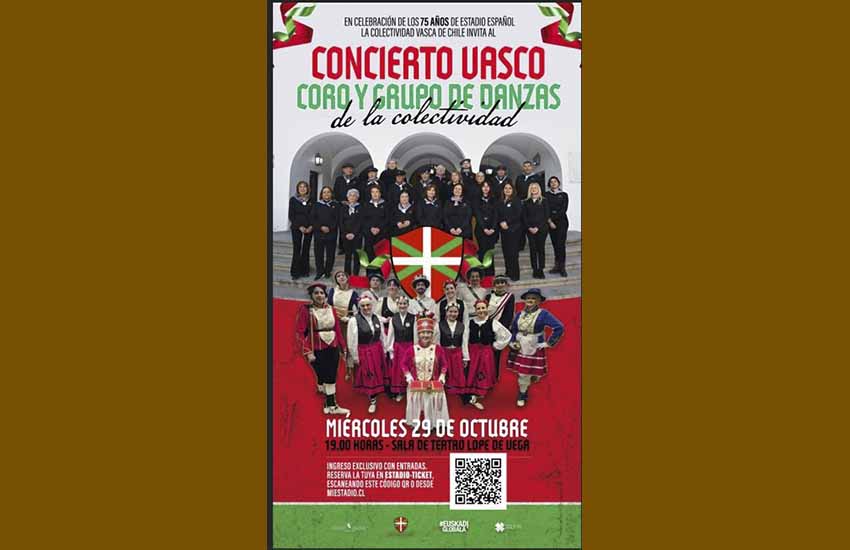 Urriaren 29an. asteazkena, 19:00etan, Colectividad Vasca de Chile euskal etxeko abesbatzak eta dantzariek 'Concierto Vasco' aurkeztuko dute Las Condesko Estadio Español-eko Lope de Vega antzerki aretoan.