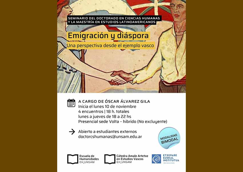 "Emigrazioa eta Diaspora: Begirada bat euskal adibidetik" Mintegia hasiko da azaroaren 10ean, astelehena, Óscar Álvarez Gila zuzendari, UNSAMeko (Universidad Nacional San Martín) Giza Zientzien Fakultateko eta Latinoamerikako Ikasketetako Masterreko programaren barruan, Giza Zientzien Doktoregoa, Buenos Aires probintzian.