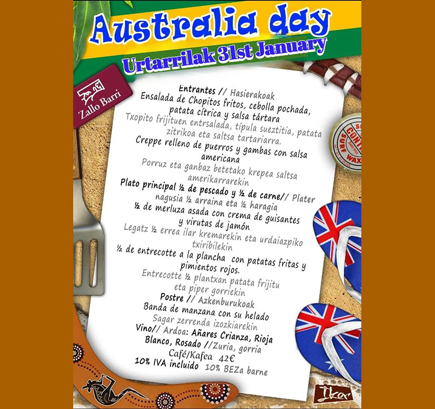 Euskal Australiar Alkarteak 'Australia Day' ospatzeko gonbidapena luzatu du, urtarrilaren 31ean, larunbata, Gernikako Zallo Barri jatetxean.