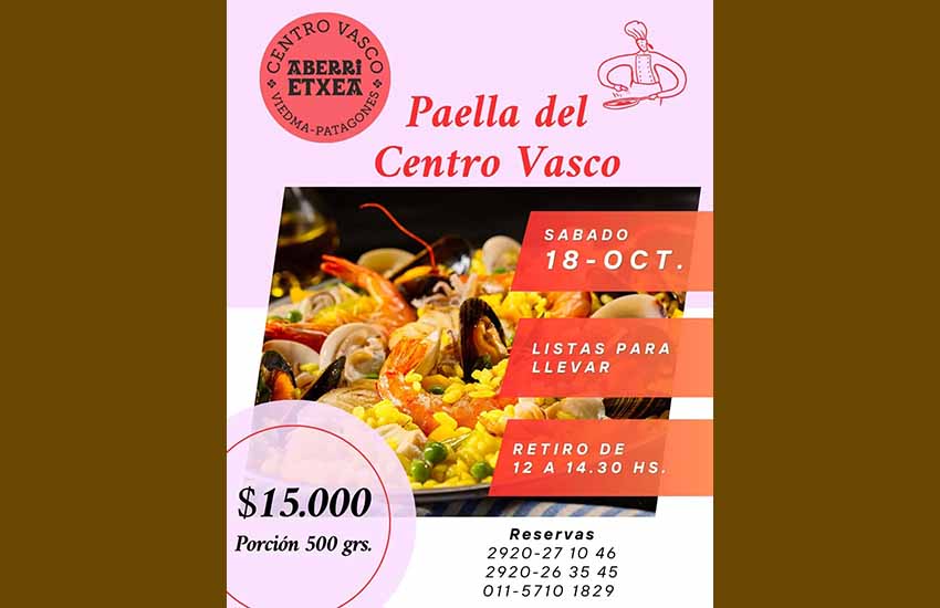 Urriaren 18an, larunbata, Viedma eta Patagonesko Aberri Etxea Euskal Etxeak bere paella salduko du, "arima elikatzeko modukoa", etxeratzeko