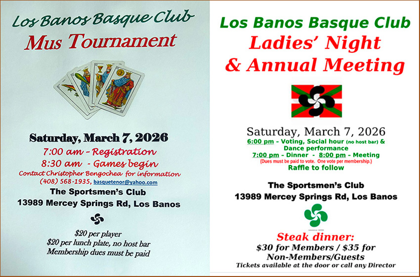 Los Banoseko Euskal Etxearen Urteroko Mus Txapelketa, Emakumeen Gaua eta Biltzar Nagusia The Sportsmen's Club-en (13989 Mercey Springs Rd).