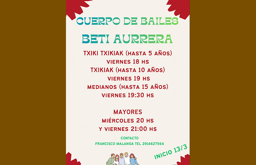 Martxoaren 13an, ostirala, Bahia Blancako Unión Vasca Euskal Etxeko txiki-txikien, txikien eta ertainen dantza taldeen eta Danborradakoaren entseguen hasiera elkartearen egoitzan (orduak eta xehetasunak bannerrean).