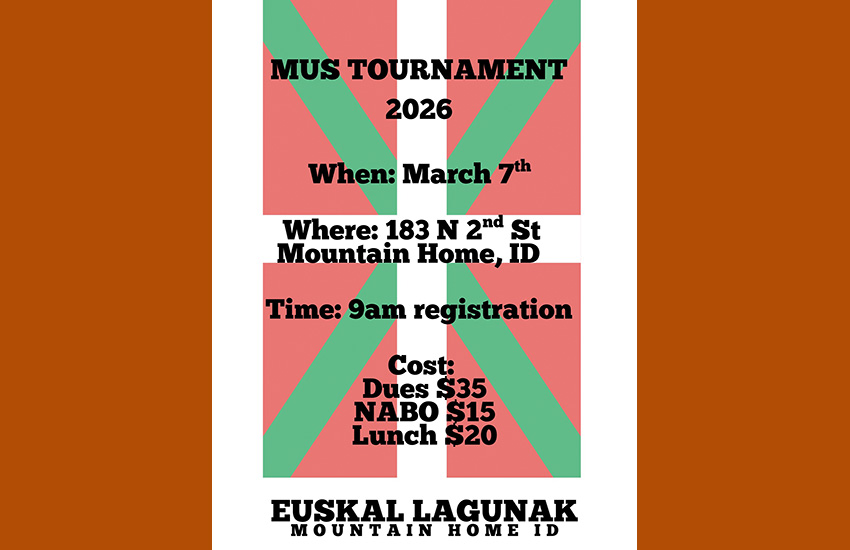 Martxoaren 7an, larunbata, Mountain Homeko Euskal Lagunak Euskal Etxeak bere Urteroko Mus Txapelketa antolatu du (183 N 2nd Street W), NABOren Nazionalerako sailkagarria.