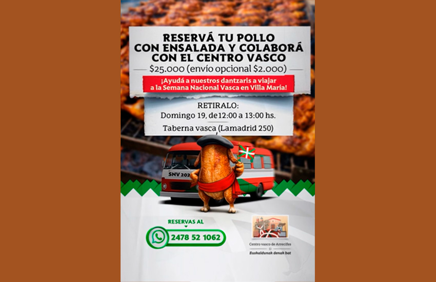 Apirilaren 19an Arrecifesko Euskaldunak Denak Bat Euskal Etxeak 'Oilaskoa eta Entsalada' anoak prestatu eta salduko ditu, bere aurrekontuaren lagungarri. Garaiz manatu.