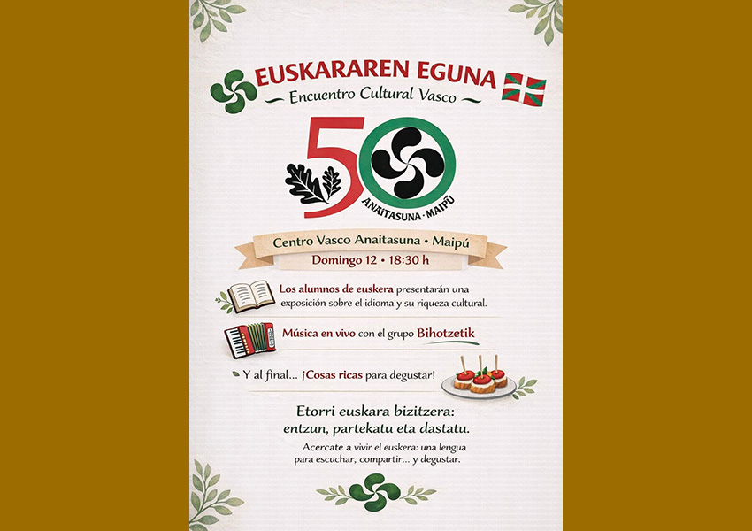 Apirilaren 12an, igandea, Euskarari eskainitako eguna ospatuko du, aurten 50 urte betetzen ari den Maipú-ko Anaitasuna Euskal Etxeak 18:30etatik aurrera.