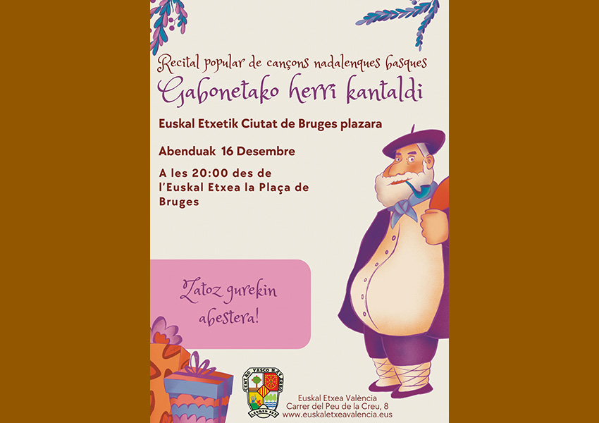 Abenduaren 16an, asteartea, 20:00etan, Valentziako Laurak Bat Euskal Etxeak gonbidatzen zaitu Gabonetako euskal abestien herri kantaldi ibiltari batera Euskal Etxearen egoitzatik Ciutat de Bruges plazara.