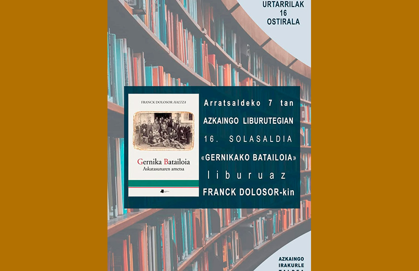 Urtarrilaren 16an, ostirala, 19:00etan, "Gernika Batailoia, askatasunaren ametsa" liburua aurkeztuko du eta solaskide izango da bertaratuko direnekin, bere egile Franck Dolosor kazetaria Azkaingo Liburutegian, bertako Irakurle Taldearen eskutik.