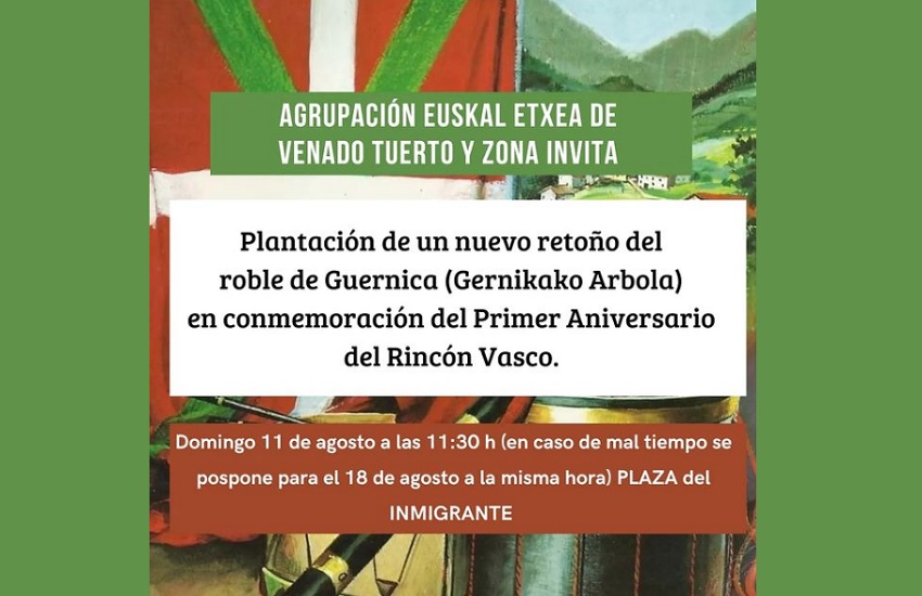 Igande honetan, abuztuaren 11an, 11:30etan, Plaza de los Inmigrantes-en, Lagunen Euskal Kultura elkarteak Gernikako Arbolaren kimu berri bat landatuko du Rincón Vascoren lehen urteurrena ospatzeko. Eguraldi txarra izanez gero, abuztuaren 18an egingo da.