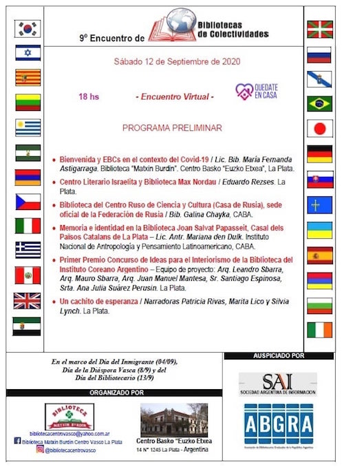 Larunbat honetan, La Platako Euzko Etxeko Matxin Burdin Liburutegiak Gizatalde Liburutegien 9. Elkarretaratzea antolatu du. Aurten elkartze birtuala izango da eta hainbat kolektibitatetako liburutegiek parte hartuko dute. Hitzordua arratsaldeko 18:00etan da.