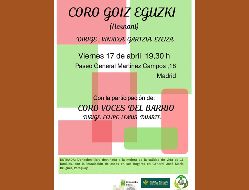 Apirilaren 17an, ostirala, Koru Kontzertua kantari direla Hernaniko 'Goiz Eguzki Abesbatza', Vinaixa Gartzia Ezeiza zuzendari, eta Madril Malasañako 'Coro Voces del Barrio', Felipe Lemus Duarte zuzendari, Paseo General Martínez Campos 18 helbidean 19:30ean, Madrilen. Xehetasun gehiago hemen.