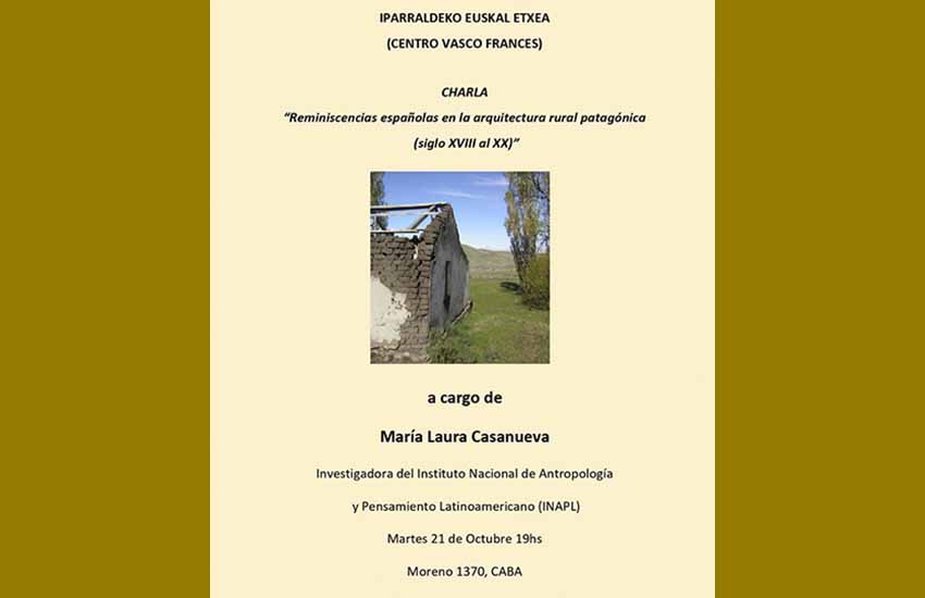 Urriaren 21ean, asteartea, hitzaldia eskainiko du Buenos Airesen 19:00etan Iparraldeko Euskal Etxean, María Laura Casanuevak, "Espainiar zantzuak Patagoniako landa arkitekturan (XVIII. mendetik XX.era)" izenburupean.