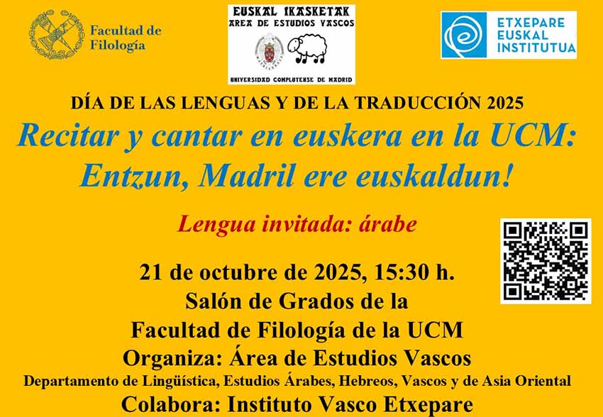 Hizkuntzen eta Itzulpenaren Eguna 2025 ospatzeko ekitaldia da, UCMko Euskal Ikasketa sailak antolatua, aurten arabiera hizkuntza gonbidatu legez (Hicham Amraoui-ren olerki bat bere jatorriko arabieran eta euskal itzulpenean irakurriko dira).