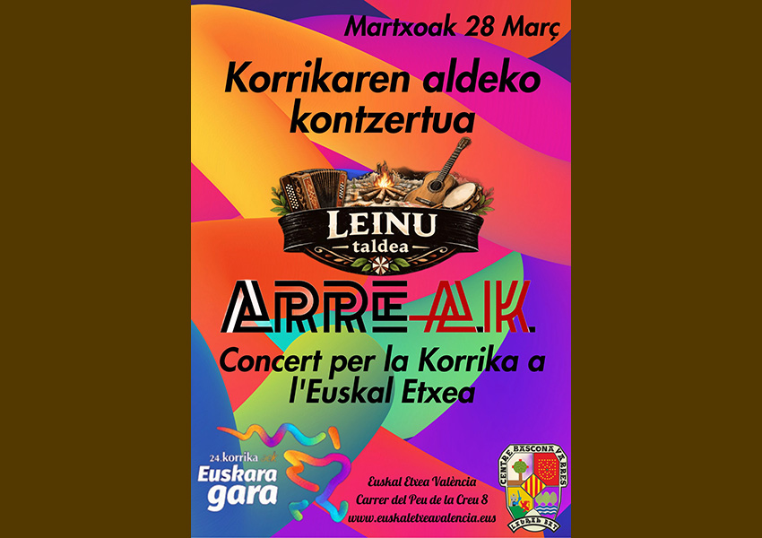 Valentziako Euskal Etxeak martxoaren 28an Korrikaren aldeko herri bazkarian izena ematera gonbidatzen zaitu, "gurekin metro batzuk Korrika egitera eta egun horretarako kalean eta Peu de la Creu 8ko beheko solairuan (Merkatu Zentralaren ondoan) prestatu ditugun musikaz eta jarduerez gozatzera". Bazkarian parte hartzeko aldez aurretik eman beharra dago izena, bakarrik 120 lagunentzako lekua baitago. Izena eman nahi dutenek EEarekin behar dute kontaktatu eta adierazitako sarrera ordaindu. Menuak 15 € balio du helduentzat eta 8 € haurrentzat."