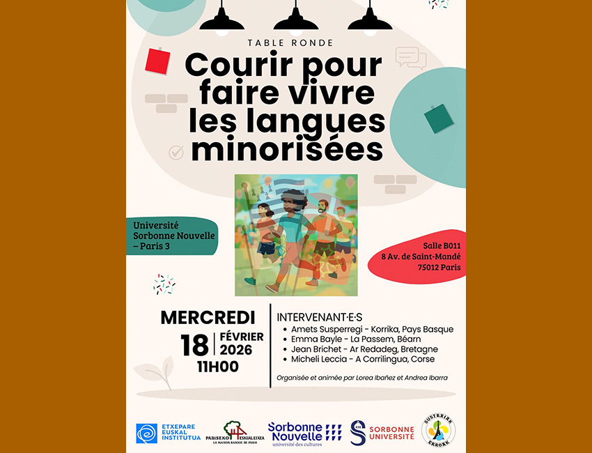 Otsailaren 18an, asteazkena, 11etan, Korrika hizkuntza gutxituak biziarazteko. Antolatzaile Etxepare Euskal Institutua, Pariseko Euskal Etxea, Sorbonne Nouvelle Unibertsitatea, Sorbonneko Unibertsitatea eta Pariseko Sustraiak Erroa elkartea.