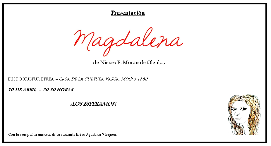 Nieves Moran de Olenka-ren 'Magdalena' liburua aurkeztuko da apirilaren 10ean, osteguna, Buenos Airesko Eusko Kultur Etxea-Casa de la Cultura Vascan (Eusketxe, Mexiko 1880), 20:30etan.
