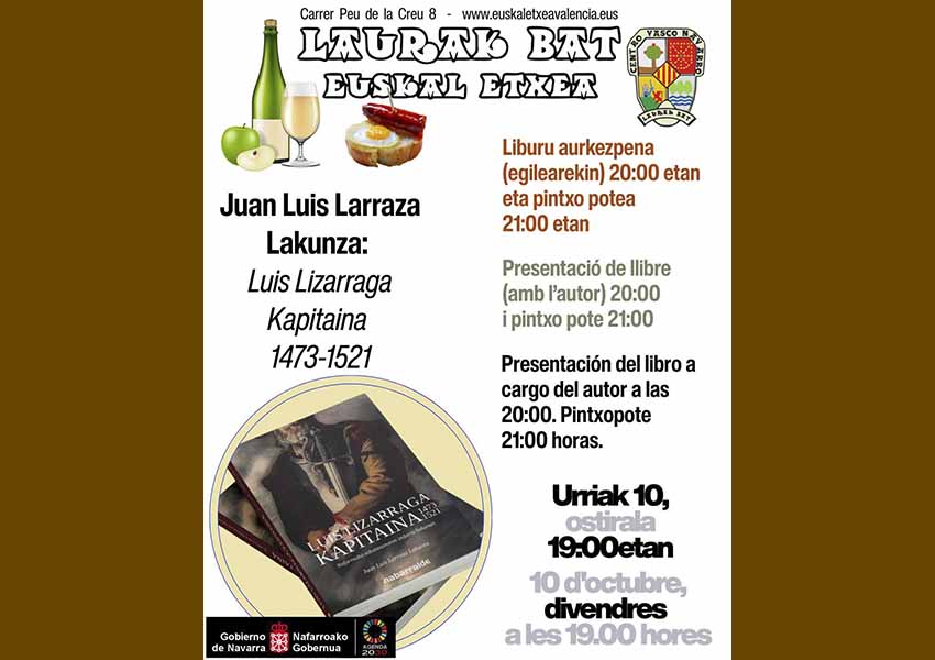Urriaren 10ean, ostirala, 20:00etan, Juan Luis Larraza Lakunzaren "Luis Lizarraga kapitaina 1473-1824" liburuaren aurkezpena Valentziako Laurak Bat Euskal Etxean, idazlea bera partaide; jarraian, 21:00etan, pintxopotea.
