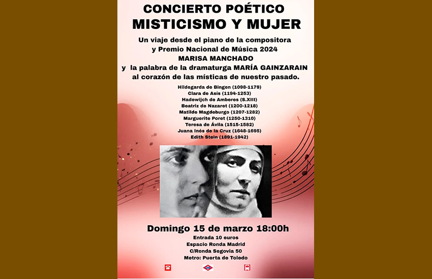Martxoaren 15ean, igandea, Maria Manchado pianista eta musikagileak eta Maria Gainzarain antzerkigileak aurkezturik, emanaldia 18:00etan, "Kontzertu poetikoa: Mistika eta emakumea" izenpean,. Espacio Ronda Madrid-en (Ronda de Segovia 50, Madril).