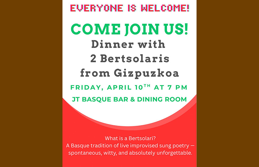 Zatoz gurekin apirilaren 10ean, ostirala, 19:00etan, Gardnervilleko JT euskal jatetxe eta kantinara.