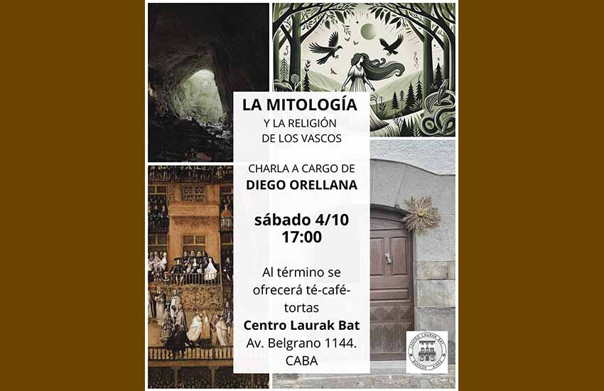 Urriaren 4an, larunbata, 17:00etan, "Mitologia eta euskaldunen erlijioa" hitzaldia emango du Laurak Bat Euskal Etxean Diego Orellanak. Amaitzean, tea edo kafea eta tortak.