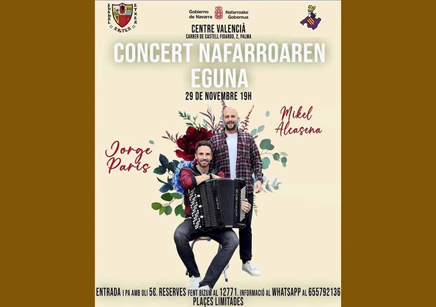 Azaroaren 29an, larunbata, Jorge Paris eta Mikel Alcasenaren kontzertua Nafarroaren Eguna ospatzeko, Mallorcako Artea Euskal Etxea antolatzaile, Centre Valencià-n, Nafarroako Gobernua lagun.