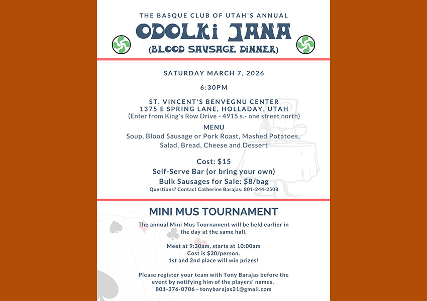 Martxoaren 7an, larunbata, urteroko Odolki Jana antolatu du Utahko Euskal Etxeak bere bazkide eta lagunentzat, Mus Mini Txapelketa bat ere tarteko, 18:30etik aurrera St. Vincent's Benvegnu Center-en (1375 E Spring Lana, Holladay, UTn).