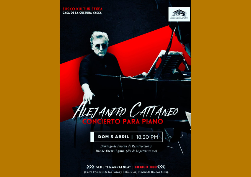 Pazko Igandea eta Aberri Eguna ospatuz, Alejandro Cattaneoren piano kontzertua antolatu du Euskal Kultur Etxea Eusketxek Lizarraenea bere egoitzan apirilaren 5ean, igandea, 18:30etan.
