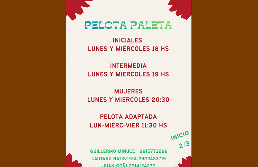 Astelehen honetan, martxoaren 2an, pilota paleta ikasturte berri bat hasiko du Bahía Blancako Unión Vasca Euskal Etxeak bere lau taldetan: hasiberriak, tartekoak, emakumeak eta pilota egokitua.