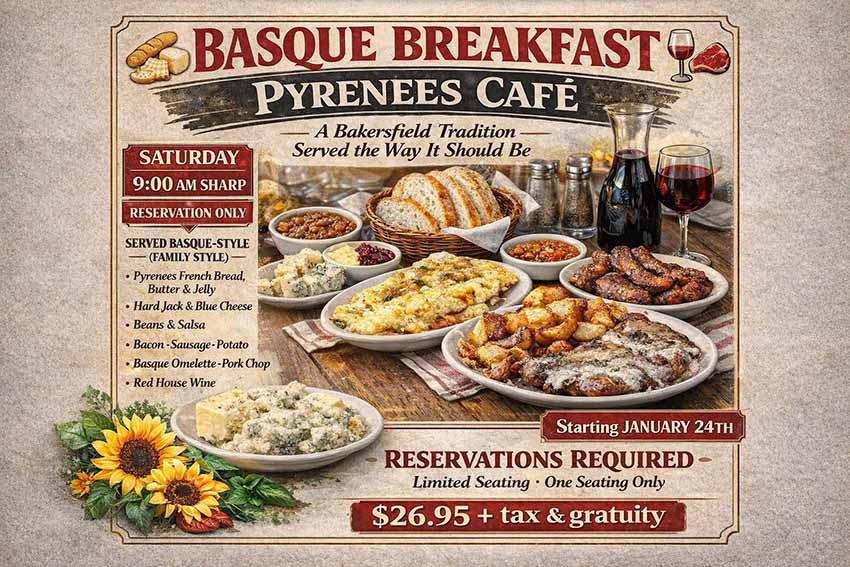Bakersfieldeko Pyrenees ostatuak gaur hasiko du aurrerantzean larunbatero eskainiko duen "Basque Breakfast" gosari 'azkarra' (Ipar Euskal Herriko adieran), euskal molde xaharrean.