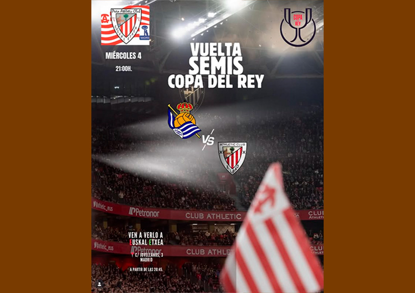 Martxoaren 4an, asteazkena, 21etan, Real Sociedad - Athleticen arteko kopa partida segitu dezakezu Madrilgo Euskal Etxean, EEko Athletic-en Peña antolatzaile.