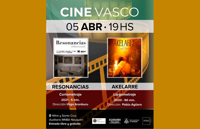 Igande honetan, apirilaren 5ean, Euskal Zinema saioa 'Resonancias' film laburra (Iñigo Aranburu zuzendari) eta 'Akelarre' luzea (Pablo Agüero zuzendari) emanez Neuquéngo MNBA (Museo Nacional de Bellas Artes) Auditoriumen, Baskos de la Confluencia euskal etxea antolatzaile.