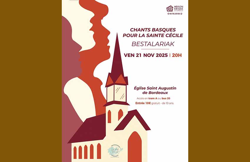 Azaroaren 21ean, ostirala, euskal kantu eta aireen Santa Zezilia kontzertua eskainiko du Bordaleko Euskal Etxeko Bestalariak koralak 20etan Bordeleko Saint Augustin elizan. Sarrerak, 10 euro; 10 urtez beheitikoek kitorik.