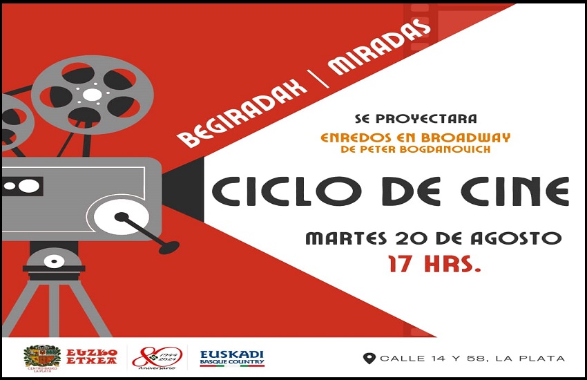 Hilabetero hirugarren asteartean film bat proiektatzen da La Platako Euzko Etxean "Begiradak=Miradas" 12. zine zikloaren baitan, EEko "Matxin Burdin" Liburutegiak antolatuta Alejandro Sánchez Morenok koordinatzaile. Astearte honetan, abuztuaren 20an, 17:00etan, Peter Bogdanovich zuzendariaren "She's Funny That Way" filma (gaztelaniaz "Enredos en Broadway" izenaz itzuli zena) proiektatuko da. Bertako areto nagusian, sarrera doan eta borondatea..