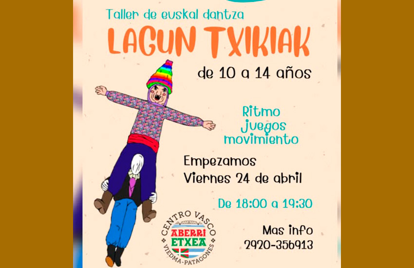 Txikientzako (10-14) "Lagun Txikiak" euskal dantza tailerra abiatuko dute gaur Viedma eta Carmen de Patagonesko Aberri Etxea Euskal Etxean. 18etatik 19:30era.