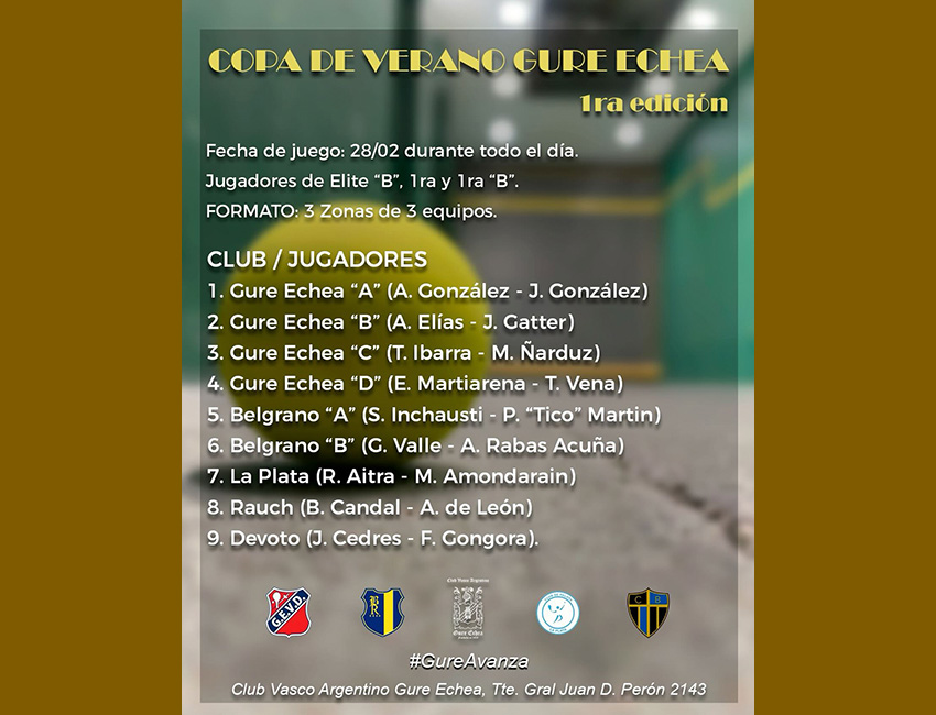 OPtsailaren 28an, larunbata, egun osoan zehar, Udako Kopa Gure Echea Euskal Argentinar Klubaren (Club Vasco Argentino Gure Echea) kantxetan, Elite B, Lehenengoko y Lehenengo Bko jokalariekin. Buffet zerbitzua egongo da.