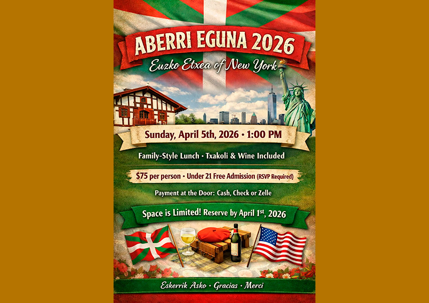 Apirilaren 5ean, igandea, Aberri Eguna ospatuko du Euzko Etxea of New York-ek (EENY) bazkari, ekitaldi eta festa antolatuz bere egoitzan (307 Eckford Street, Brooklyn, NY 11222).