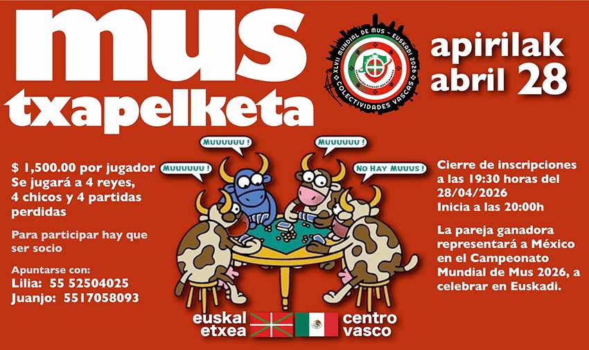 Apirilaren 28an, asteartea, 20:00etatik aurrera, Urteroko Mus Txapelketa egingo dute Mexikoko Euskal Etxean, Mundukorako sailkagarria.