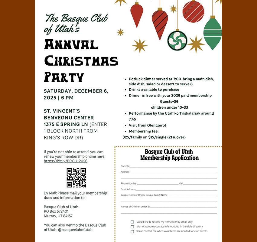 Azaroaren 6an, 18etatik aurrera, Utah-ko Euskal Etxearen Eguberri Festa, afari partekatua, dantzariak, Olentzeroren bisita... St Vincent's Benvegnu Center-en (1375 E Spring).