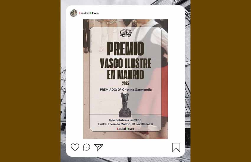 Urriaren 8an, asteazkena, 19:30ean, Madrilgo Euskal Etxeak bere 'Vasco Ilustre' 2025 saria Cristina Garmendiari emango dio, erakundearen ekitaldi aretoan, eta ondotik zintzur bustitze bat egingo da EEko egongelan.