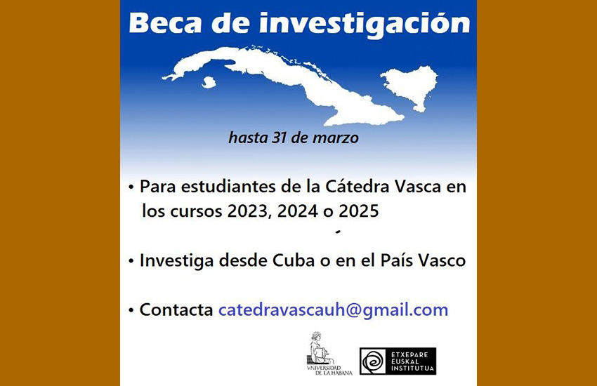 Zabalik martxoaren 31era arte ikerketa bekak Habanako Unibertsitatean Euskal Katedrako 2023, 2024 edo 2025eko kurtsoetako ikasleentzat, ikerketa Kubatik edo Euskal Herritik egiteko.