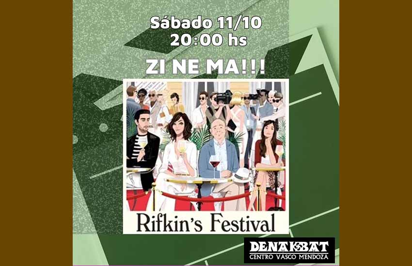 Urriaren 11n, 20:00etan, "Zinema eta pintxo" saioa Mendozako Denak Bat Euskal Etxean, Woody Allen-en "Rifkin´s Festival" emanez, eta ondoren, nahi duenak, pintxoak dastatzeko aukerarekin. Filma, doan.