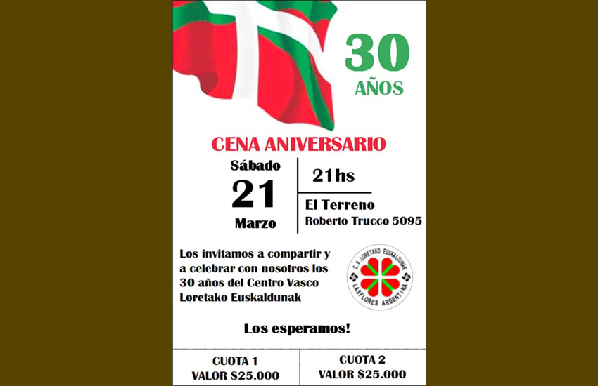 Zorionak, Loretako Euskaldunak! Martxoaren 21ean, larunbata, Euskal Etxearen 25. urteurrena ospatzeko afari eta festa.