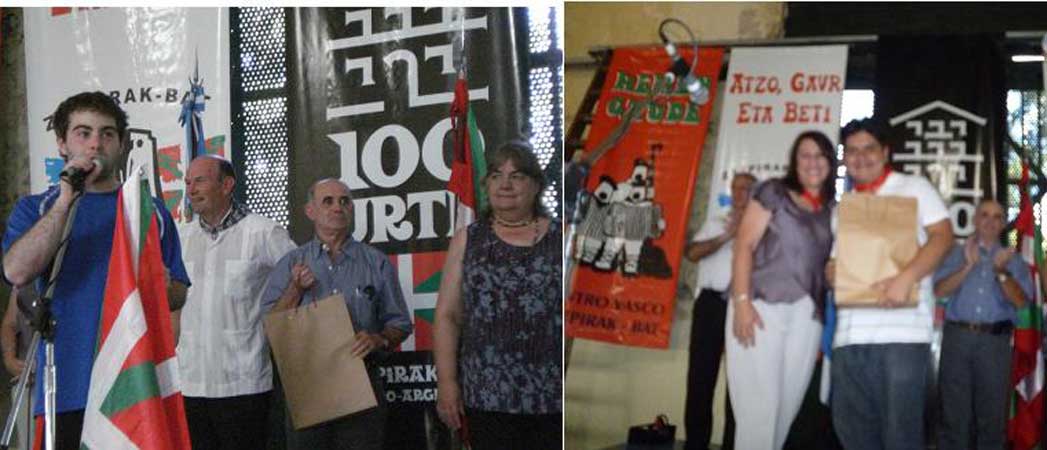 [Euskara bultzatzeko urtero egiten diren lehiaketetako sariak ere banatu ziren igandean. Juan Jose Ibarretxe, Ricardo Basterra, Monica Fein Rosarioko alkatea, Enrique Otaño Zazpirak Bat-eko lehendakaria eta Alicia Igarzabal euskal etxeko alkatea igo ziren taula gainera sariak banatzera. Argiaren sorlekua izeneko testuarekinlehenengo saria Cordobako Gerora elkarteko Noe Fernandezentzat izan zen. Monica Fein-ek eskuratu zion saria Fernandez-i (argazkia EuskalKultura.com)]