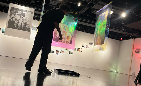 Ayumi Aguirre Kanakuri 'Pandora' erakusketan, bere lanez inguratua