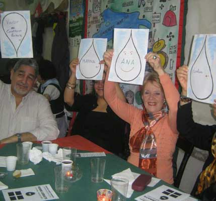 Antolatzaileek ekintza sorta prestatu zuten afalosterako. Hasteko, gonbidatu bakoitzak bere izena idatzi zuen paperezko "ur-tanta" batean eta tantak, jolasteko fitxa bihurtu ziren. Carlos Martinezek trinketearen zoluan margotutako “Senpere lakuan” zehar ibili ziren jokalariak, galderak erantzuten.